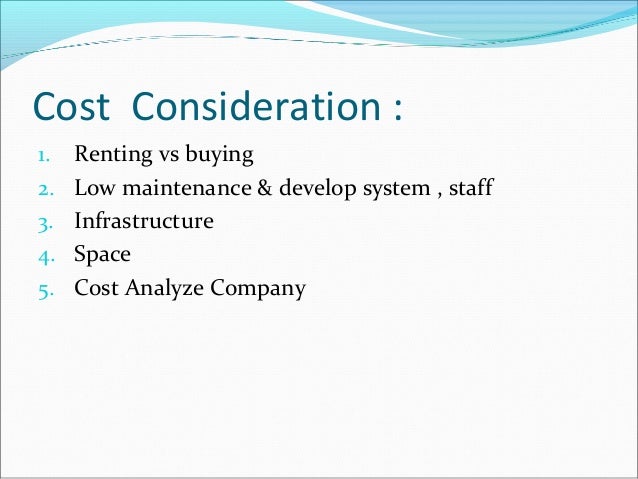 ($10,000), and the cost of annual software upgrades ($5,000). The costs of renting hosted software are the rental fees ($2500 annually per user), implementation and customization costs ($12,000 in the first year), and training ($10,000 in the first year). • Use your spreadsheet software to calculate the total cost of renting or purchasing ... Content Retrieval